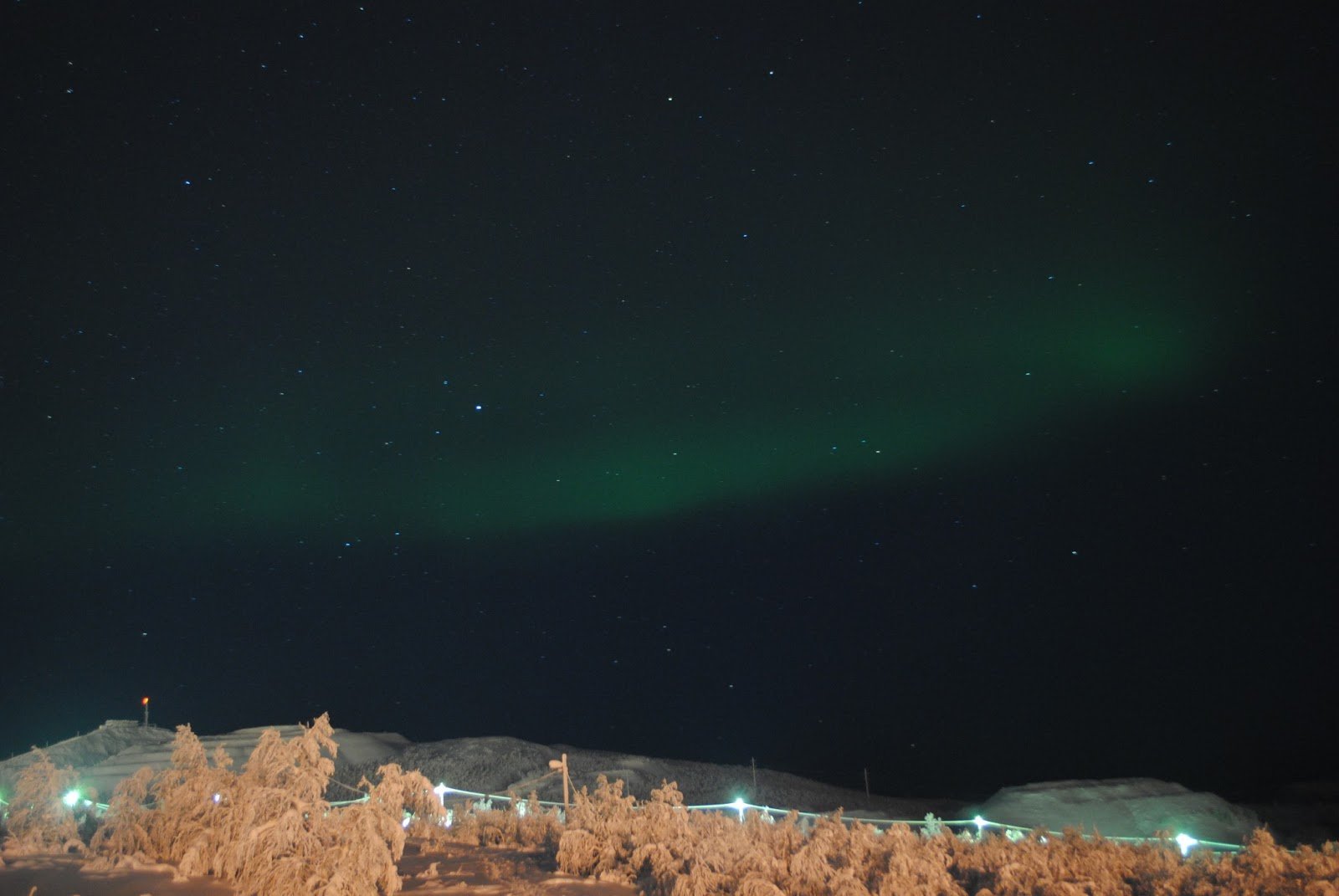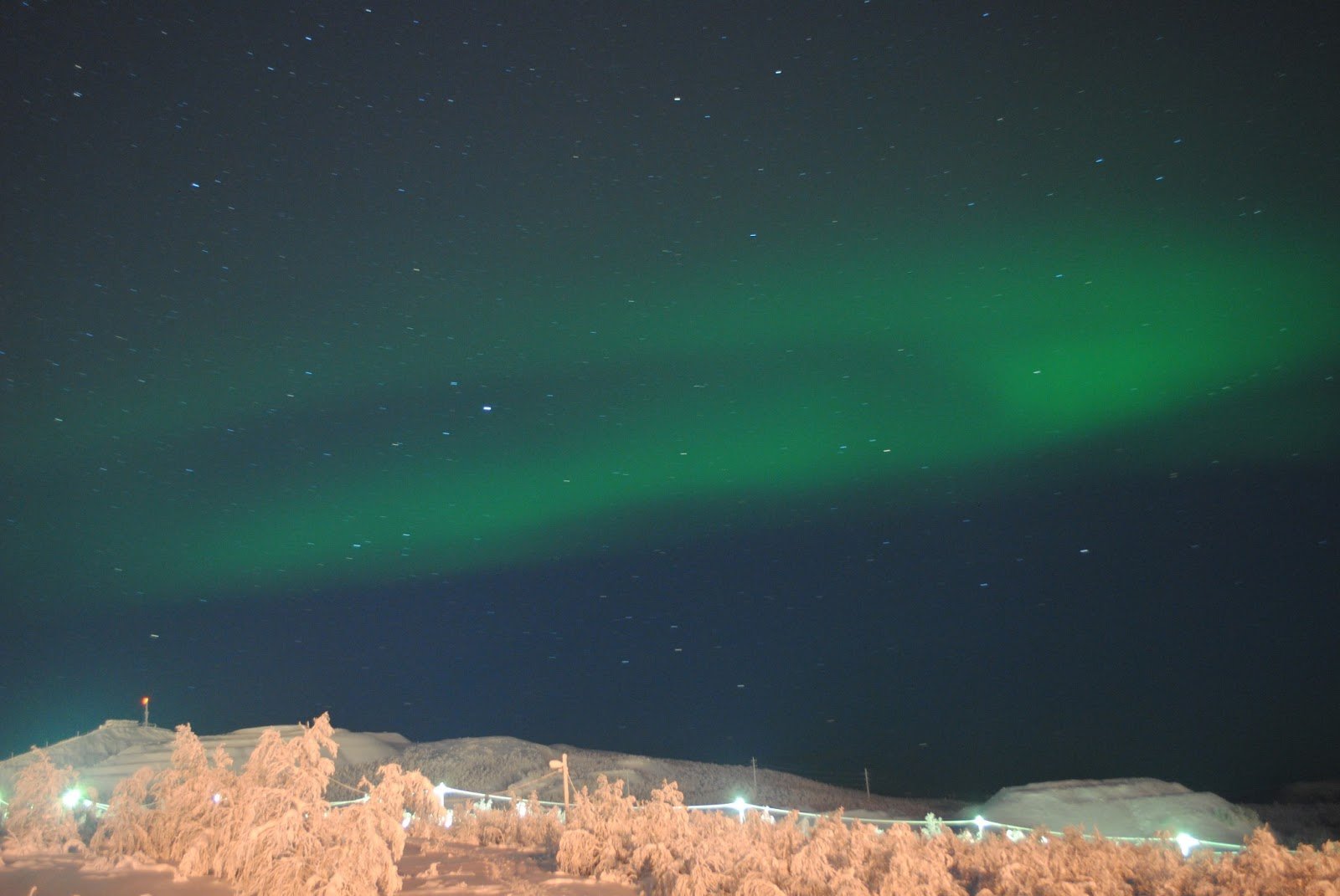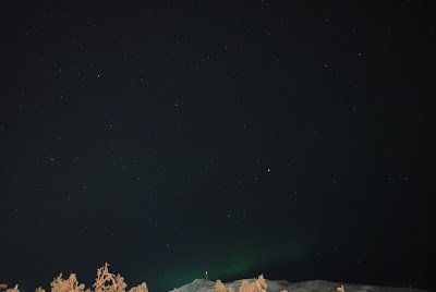 さて、オーロラが一体何者なのかが判明したところで、本題に移りたいと思います。オーロラ旅行最後の夜は、見事に晴れ。友人から、オーロラ観測スポットとしてホテル・リーパン付近を薦められていたので、夜9時頃に早速行ってみることに(宿泊客では無かったのですが)。すると丘の上にすでに20人くらいの人が三脚構えてスタンバってるではないですか!近づいてみると、日本人の団体ツアー客でした。団体ツアーが薦めるスポットならば、間違いない!と思い、私たちもそこでスタンバることに。