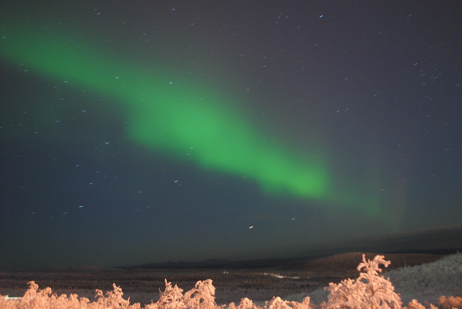 待つこと、30分くらいでしょうか。うっすらと、オーロラが見え始め、そこから徐々に活動が強まっていきました。まるでマリリン・モンローのスカートのように(?)ヒラヒラと夜空を舞うオーロラは、私がこの世で見た自然現象の中で最も美しいものでした。
