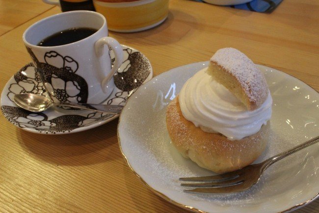 完成後は全員でfikaです。それぞれ思うがままにセレクトしたのですが、僕はこのセムラとオーガニックコーヒーのセットをいただきました。